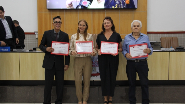 Solenidade – Antes da Ordem do Dia, o Cerimonial da Câmara realizou Ato Solene de entrega do Diploma “Cirurgião-Dentista Destaque do Ano”, nos termos do Decreto Legislativo nº 411/2019, de autoria dos vereadores Luís Flávio (PT), ex-vereadora Dra. Márcia Santos e Dr. Rodrigo Salomon (PSD). Foram homenageados os profissionais Adriana Ferreira Pinto, Camila Flávia de Paiva Grecco Santos, João Paulo Pinto e Wilson Fontenelle Marques.