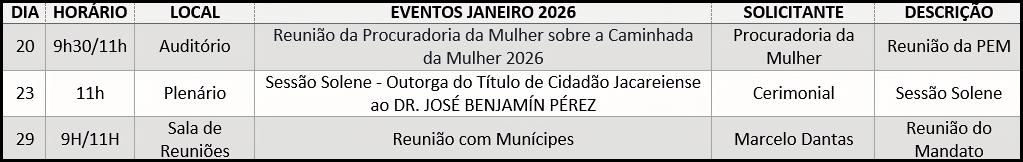 Acompanhe os eventos realizados na Câmara de Jacareí. Os encontros não são, necessariamente, organizados pelo Legislativo, uma vez que a Câmara cede seu espaço físico para reuniões e encontros de entidades representativas, partido políticos e ações ligadas ao mandato do vereador. As agendas podem sofrer alterações de data e horário. Para mais Informações, entre em contato com o Cerimonial da Câmara pelo telefone: 12-3955-2276