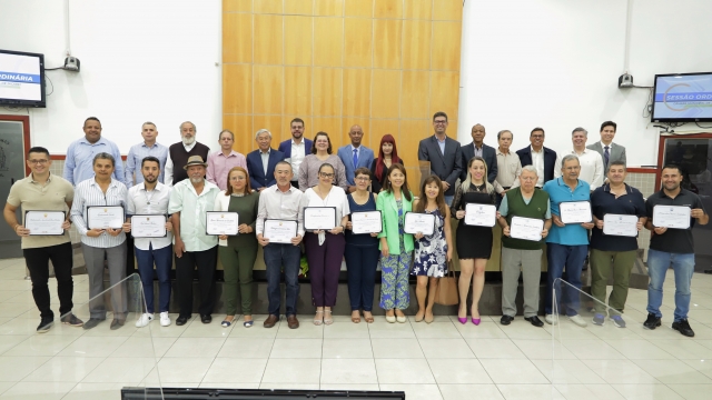 Comércio Nota 10 – Antes do início da Ordem do Dia o Cerimonial da Câmara realizou Ato Solene para entrega do Certificado de Qualidade de Serviços Comerciais “Comércio Nota 10”, de acordo com o Decreto Legislativo nº 348/2014, de autoria do ex-vereador Fernando da Ótica Original.
