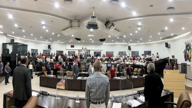 Solenidades – Antes do início da sessão, o Cerimonial da Câmara realizou os atos solenes “Orando por Jacareí” e “Homenagem ao Trabalhador”, conforme os Decretos Legislativos números 361/2015 e 165/1998, de autoria do vereador Rogério Timóteo (REPUBLICANOS) e do ex-vereador José Carlos Diogo, respectivamente.