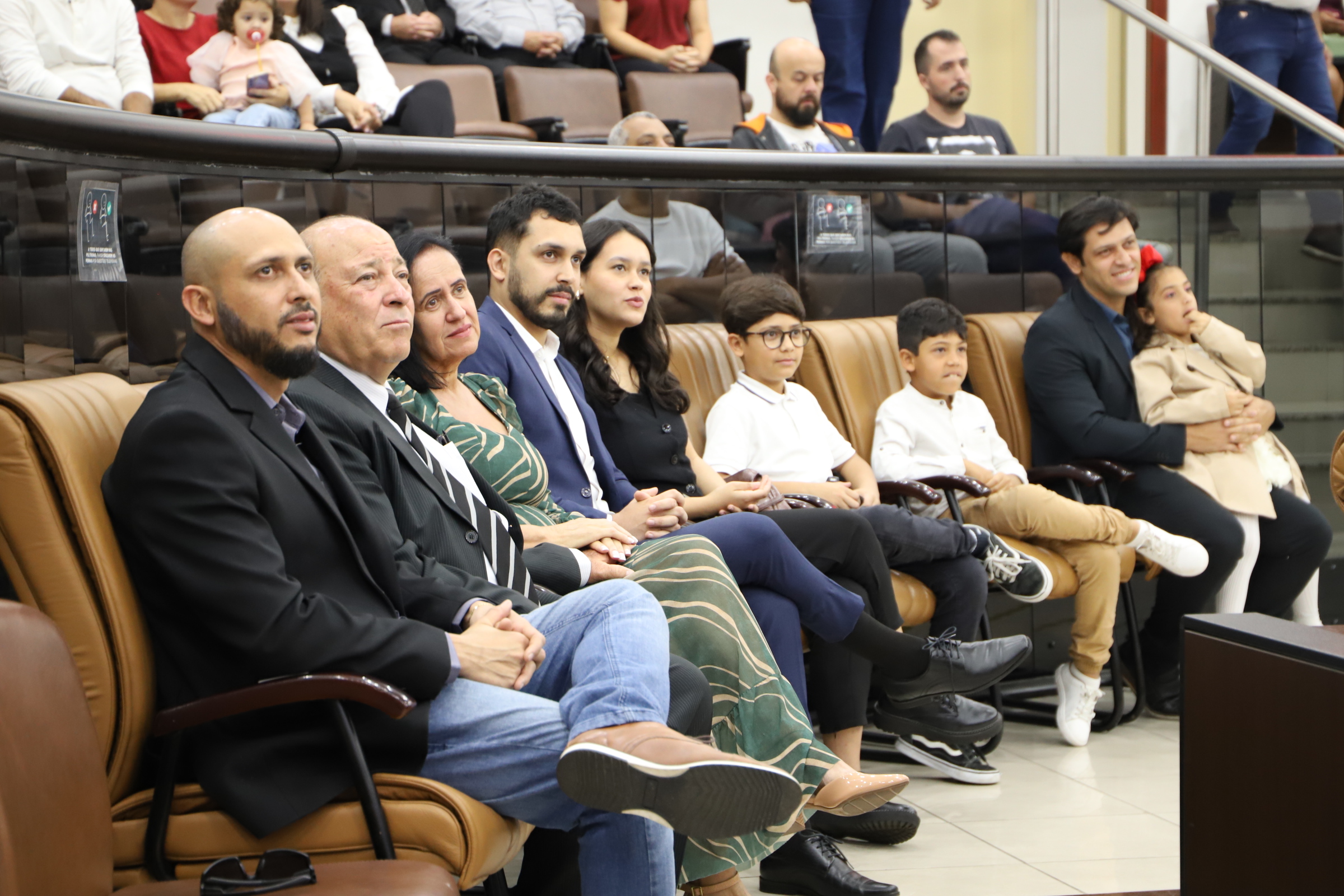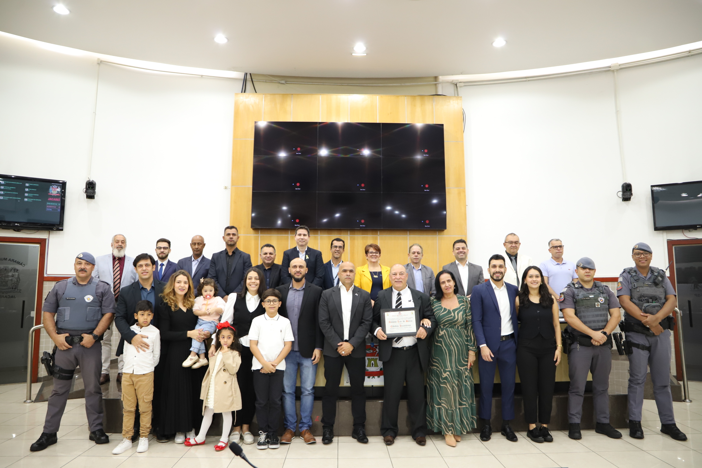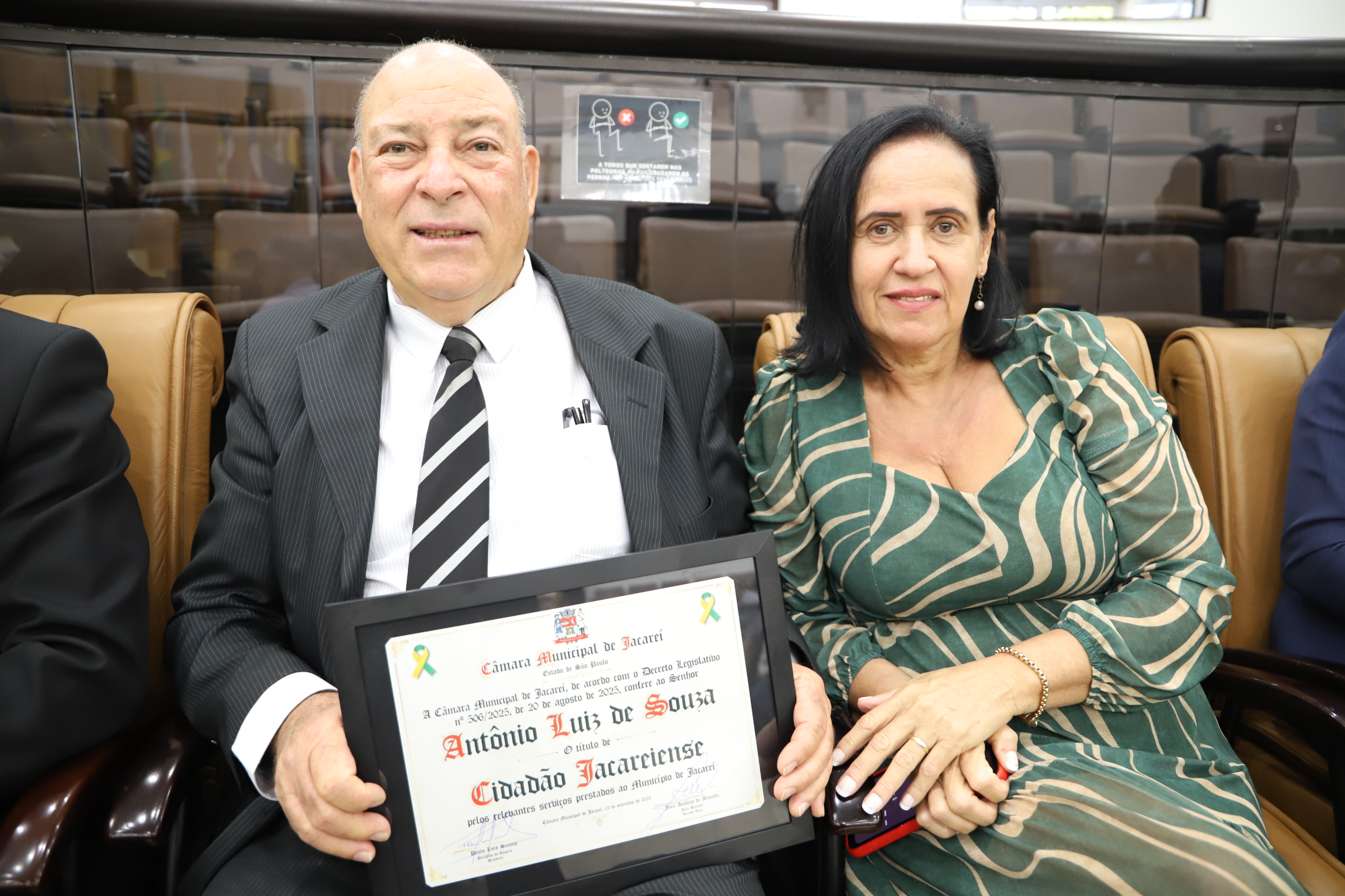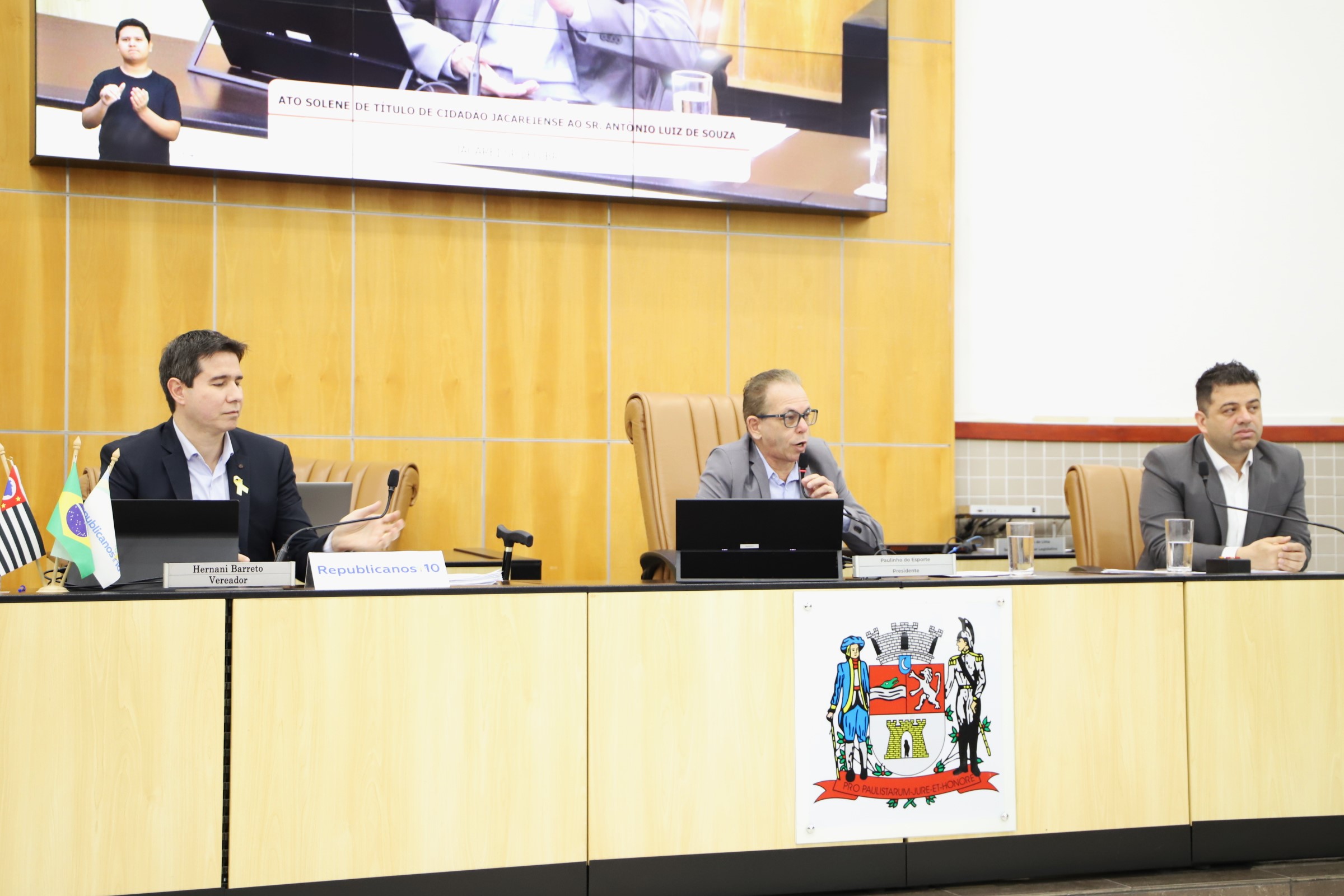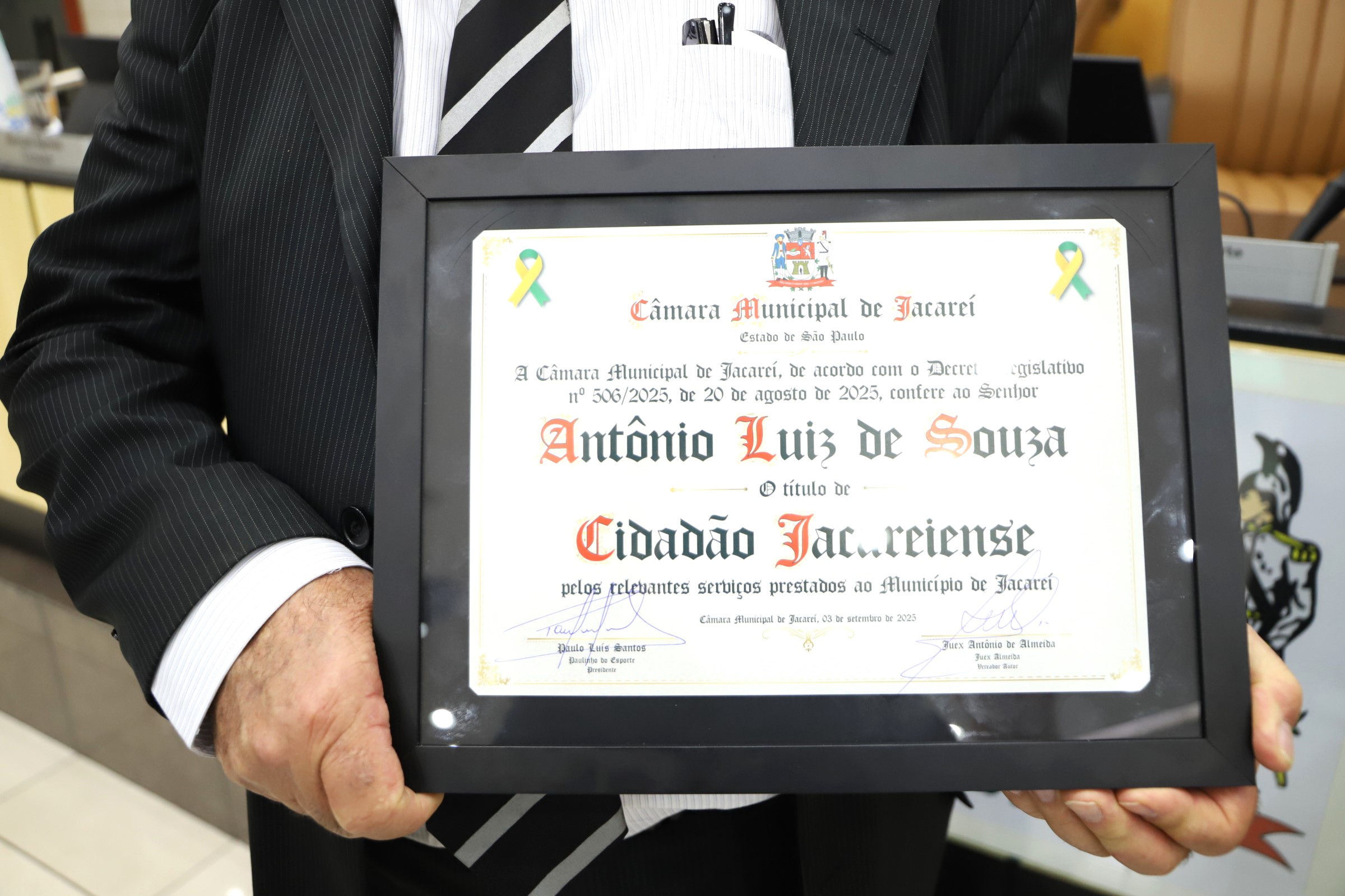 Solenidade – Antes da Ordem do Dia, o Cerimonial da Câmara realizou Ato Solene de outorga do Título de Cidadão Jacareiense ao senhor Luiz Antônio de Souza, nos termos do Decreto Legislativo nº 506/2025, de autoria do vereador Juex Almeida (PP).
